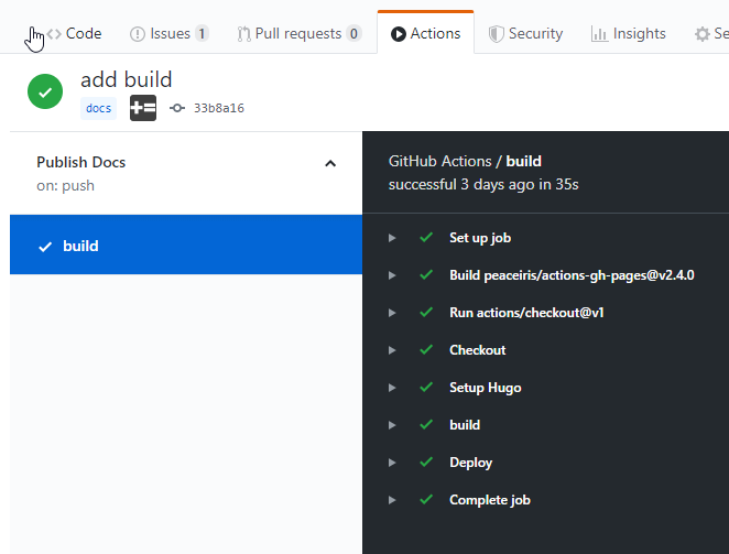 With all of this in place you are ready to commit to master. This should kick off the publish workflow, which you can view under Actions > Publish Docs.